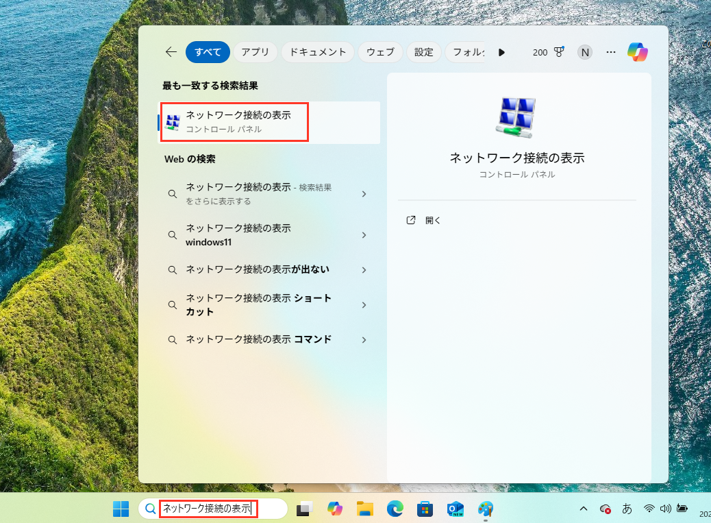 タスクバーの検索ボックスに「 ネットワーク接続の表示 」と入力し、検索結果の「 ネットワーク接続の表示 」をクリックします。