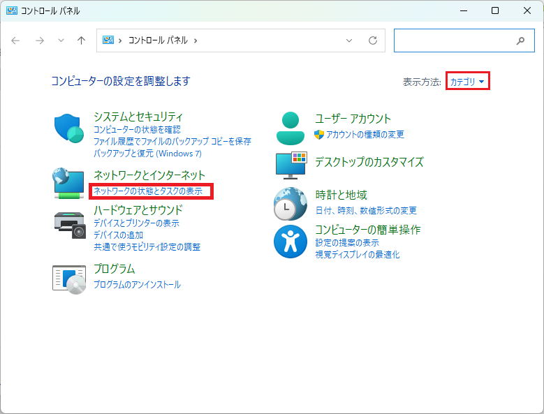 「 表示方法 」を「 カテゴリ 」にしておきます。「 ネットワークの状態とタスクの表示 」をクリックします。