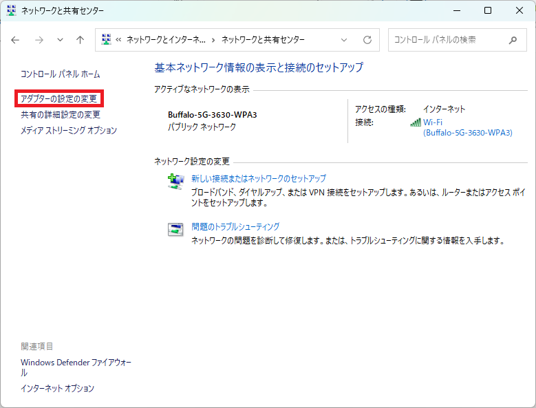 「 アダプターの設定の変更 」をクリックします。