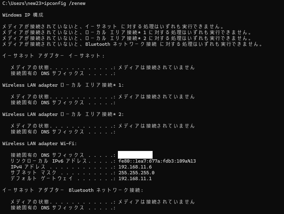 「 ipconfig /renew 」でIPアドレスを取得します。