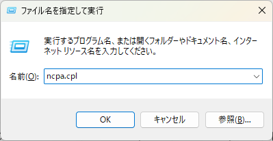 「 ファイル名を指定して実行 」の「 名前 」の入力欄に「 ncpa.cpl 」と入力し、OKをクリックします。