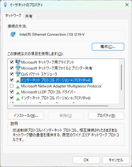 IPv4 の設定を確認するには、「 インターネットプロトコルバージョン4(TCP/IPv4) 」を選択し、プロパティをクリックします。
