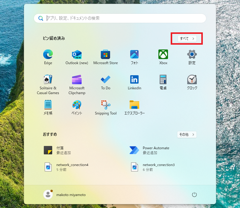 「 スタートメニュー 」をクリックし「 すべて 」をクリックします。